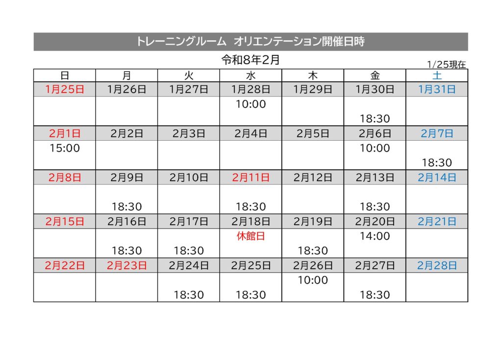 KUROKIRI STADIUM内のトレーニングルームの利用前オリエンテーション(器具等説明会:20分程度)実施スケジュール【2月分】をお知らせします。